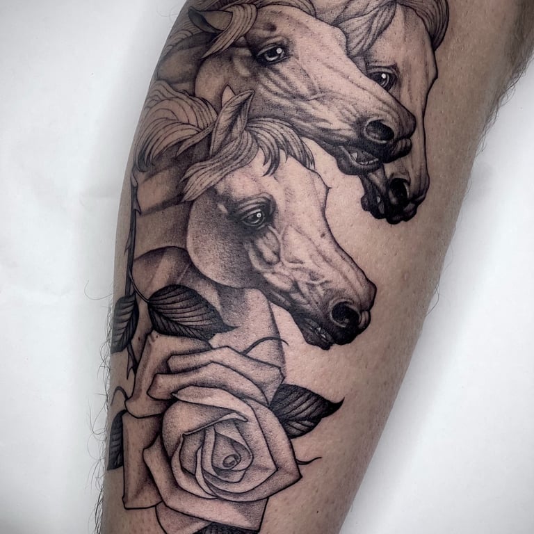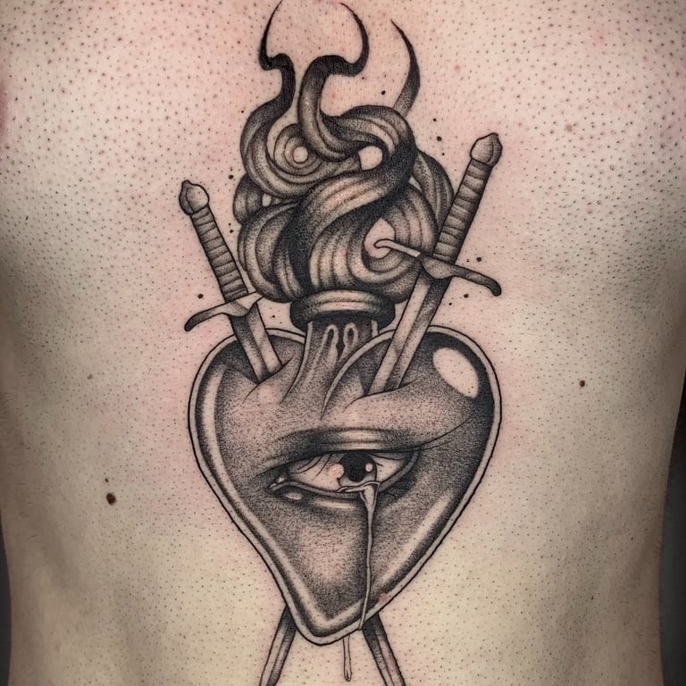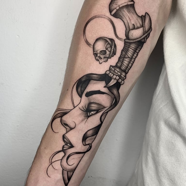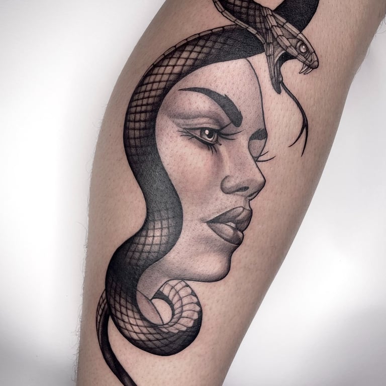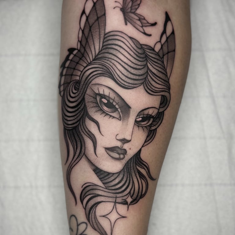 El blackwork con puntillismo, heredero del estilo chicano, combina la fuerza de las sombras con la precisión de la línea fina. Cada punto y cada trazo construyen figuras que emergen con elegancia y dramatismo, creando composiciones versátiles y de gran impacto visual, perfectas para quienes buscan un tatuaje con carácter y detalle.